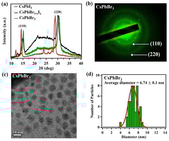 (a) the XRD spectra for CsPbI3 (red), CsPbBr3−xIx (black) and CsPbBr3 (green) single-layer printed films; (b) SAED of CsPbBr3; (c) TEM of CsPbBr3; and (d) nanoparticle size distribution histogram for CsPbBr3.