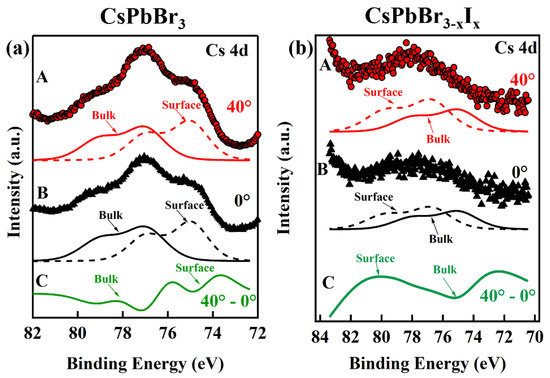 Interestingly, a surface-to-bulk core level shift [60,61,62] was observed for the Cs 4d core level XPS feature for both the CsPbBr3 and the alloy CsPbBr3−xIx single-layer printed films, the latter of which forms from the direct mixing of the different anion nanoparticles in solution prior to printing, as shown in Figure 4a and Figure 4b, respectively. In order to increase the surface sensitivity of XPS, the photoemitted electron take-off angle was varied from 0° to 40°. By increasing the take-off angle of the emitted electrons from 0° to 40°, the intensity of a surface contribution will appear to increase in intensity relative to the bulk contribution [60,61]. In Figure 4a,b, curve A (red dots) corresponds to a photoemitted electron takeoff angle of 40° and curve B (black triangles) corresponds to a takeoff angle of 0°, with respect to the surface normal. Beneath each curve, the surface (dashed lines) and bulk (solid lines) contribution fittings are displayed. The intensity difference, curve C, between curve A and curve B, is plotted as a solid green line.
