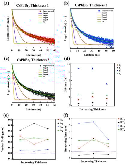 The extended broadening along the time axis, as is apparent in the TRPL data of Figure 5a–c, is a major source of errors in most TRPL fittings if left unaccounted for in the fitting function. It is also challenging to establish a single source or physical process responsible for the broadening due to the complexities inherent in the exciton formation and subsequent recombination process. Once an exciton is formed radiative and non-radiative interactions exist and thus associated recombination and charge transfer rates [74]. Non-radiative interactions that may or may not induce recombination can delay or expedite the eventual recombination of the exciton. The temporal delay leads to a broadening or horizontal stretching along the time axis in TRPL spectra. The broadening terms for each exponential subpeak from Equation (1) versus increasing film thickness are plotted in Figure 5f. In this study, the broadening term is defined as follows: