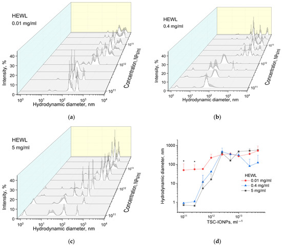 Figure 6a–c shows the particle diameter distributions weighted by intensities, obtained by MADLS for HEWL (0.01, 0.4, and 5 mg/mL) and TSC-IONP (from 1011 to 5 × 1013 mL−1) solutions. No concentration dependence of NPs sizes was found. In the studied concentration range from 1011 to 5 × 1013, the peaks of the distribution intensities were the same as for the concentration of 1013 in Figure 1. It can be seen from all the graphs that with an increase in the concentration of NPs, the size of aggregates of the protein with NPs increases. According to Figure 6a, intensity peaks are not visible in the region of 1 nm associated with individual HEWL molecules. This is explained by the fact that the region is out of the sensitivity range of the device. The device manufacturer recommends 0.1 mg/mL protein as a minimum concentration for valid measurement. At a protein concentration of 0.4 mg/mL, the intensity peaks in the region of 1 nm are also remarkably smaller than at 5 mg/mL. In concentration dependencies with high protein content, single peaks of HEWL molecules disappear when TSC-IONPs are added at a concentration of ~1012–2.5 × 1012 (Figure 6b,c).