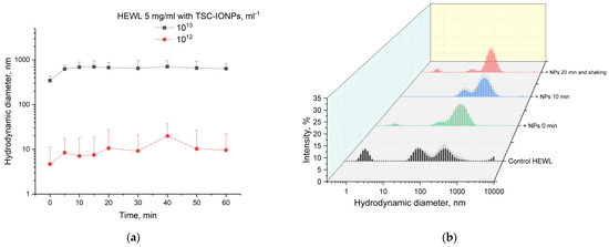 (a) Time dependence of the average size of hydrodynamic diameter of HEWL (5 mg/mL) for TSC-IONPs (1012 and 1013 mL−1). Results are presented as mean and SD for three independent experiments. (b) DLS intensity data for solution HEWL (10 mg/mL) with TSC-IONPs (1012 mL−1): HEWL control, immediately after the addition of NPs, after 10 min, after 20 min; in addition, the sample was shaken for 10 s on a Biosan V1-plus vortex. Mean and SD were calculated from five measurements.