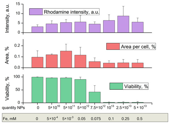 The area of cells increases (grows ~57% compared to control, statistically significant difference p < 0.01, t-test) up to the concentration of NPs 5 × 1011, and then decreases relative to the control after TSC-IONP concentrations 7.5 × 1012 (Figure 8). One-way ANOVA showed statistical significance F (7, 111) = 9.86 with p << 0.001 in differences of the mean of the group. This indicates that at least one of the groups does not lie in the total group. Statistically significant changes (one-way ANOVA F (7, 94) = 5.1505, p << 0.001) were also observed for the rhodamine intensity when adding TSC-IONPs (Figure 8). Although the picture is not as clear as with the area and there is large SD, there is a tendency to increase the rhodamine intensity with an increase in the concentration of NPs. The same data for TSC is included in the Supplementary Materials (Figures S8–S10), because no significant differences were found between the control and cells treated with 0.1 mM TSC.
