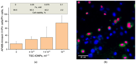 It turned out that in a wide range of concentrations up to 5 × 1012 mL−1, NPs do not have a significant effect on cell viability (Figure 8 and Figure 9). Further, the viability sharply decreases when TSC-IONPs are added. At 1013 NPs concentrations, only a small percentage of cells remains viable (2.1 ± 1.3%). For comparison, iron concentrations are shown below in Figure 8. The concentrations were calculated according to MADLS data (Figure 1) from the number of 10 nm NP aggregates, each of which contains approximately 15 NPs 2.8 nm in diameter (Figure 2b).