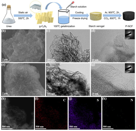 The introduction of g-C3N4 as both a nitrogen source and sacrificial template in the starch gelatinization enables the preparation of nitrogen-doped carbon materials with abundant pores. Following this methodology, nitrogen-rich carbon foam (NCF) based on porosity engineering strategy (P-NCF) was synthesized and the schematic process is summarized in Figure 1a. First, the g-C3N4 was obtained via pyrolysis of urea in static air [43]. During the subsequent high-temperature carbonization, g-C3N4 degrades automatically and creates porous structures and nitrogen heteroatoms in the carbon matrix [44]. The g-C3N4 was dispersed in deionized water and heated to 100 °C under vigorous stirring. Subsequently, the starch solution was added into the aforementioned mixture under continuous stirring, and the mixture gradually thickened. After the starch gelatinization process, the viscous mixture is cooled to room temperature and freeze dried to obtain starch xerogel. Subsequently, the starch xerogel was carbonized at 900 °C under Ar atmosphere, and then activated at 800 °C under CO2 atmosphere to form the final product P-NCF. In contrast, the sample without CO2 activation is named as NCF. The final cathode materials S@P-NCF and S@NCF were obtained by an initial sulfur vapor-infiltrated method at 500 °C and a following heat treatment at 200 °C to remove the surficial sulfur. The morphologies of the carbon hosts and sulfur-impregnated composites were characterized by scanning electron microscopy (SEM) and transmission electron microscopy (TEM). As shown in Figure 1b–g, Figures S1 and S2, all samples exhibit a macro-morphology, which consists of graphene-like flexible ultrathin nanosheets. The structure stability of P-NCF/NCF as a sulfur host is verified by the unchanged macro-morphology after sulfur loading. There are no agglomerated sulfur particles in Figure 1e–g and Figure S2, indicating the complete penetration of sulfur into the porosity of carbon hosts. As further evidence, the energy-dispersive X-ray spectroscopy (EDS) mappings show a uniform distribution of sulfur signal in P-NCF (Figure 1h–j). Notably, in the selected area electron diffraction (SAED) patterns (Figure 1g inset and Figure S2c inset), only diffuse diffraction rings are observed, suggesting the amorphous texture of sulfur in the composites. The nitrogen signal overlaps well with the carbon matrix, indicating a nitrogen-rich surface chemistry of the sulfur host. The nitrogen groups enhance the polarity of the carbon surface, which increase the affinity between the sulfur species and carbon host [45].