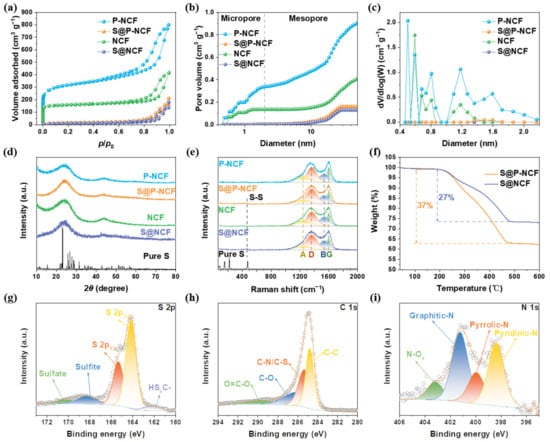 (a) Nitrogen adsorption–desorption isotherms, (b) cumulative pore volumes, and (c) pore size distributions of P-NCF, S@P-NCF, NCF, and S@NCF. (d) XRD patterns and (e) Raman spectra of P-NCF, S@P-NCF, NCF, S@NCF, and pure S. (f) TGA curves of S@P-NCF and S@NCF. High-resolution XPS spectra of (g) S 2p, (h) C 1s for S@P-NCF, and (i) N 1s for P-NCF.
