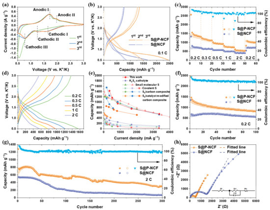 The rate capabilities of sulfur cathodes were measured at current densities from 0.2 to 2 C (Figure 3c). The S@P-NCF delivers reversible capacities of 1430, 1170, 950, 755, and 560 mAh g−1 at 0.2, 0.3, 0.5, 1, and 2 C, respectively. On the contrary, S@NCF only delivers capacities of 680 and 400 mAh g−1 at current densities of 0.2 and 2 C, respectively, much lower than that of S@P-NCF. However, at small current densities S@P-NCF exhibits a more rapid capacity decay than S@NCF. Figure 3d shows the corresponding discharge/charge profiles of S@P-NCF under various current densities, which reveal much lower polarization potentials, compared to S@NCF (Figure S7). As illustrated in Figure 3e, compared with recently reported KSBs, the rate performance of our S@P-NCF is among the best to date [56,57,62,63,64,65,66,67,68,69,70,71]. Figure 3f shows the cycling performances of S@P-NCF and S@NCF at the current density of 0.2 C. The S@P-NCF exhibits a much higher specific capacity, with an initial reversible capacity of 1470 mAh g−1. After 100 cycles, the remaining capacity is 832 mAh g−1 and the Coulombic efficiency is ~100%. S@NCF only delivers an initial reversible capacity of 690 mAh g−1 and remaining capacity of 556 mAh g−1 after 100 cycles. The higher specific capacity of S@P-NCF demonstrates that more abundant micropores and larger polar surface area can enhance the interaction between sulfur and carbon matrix, and thus promote the conversion of sulfur species and realize higher utilization of sulfur. In addition, during the cycling process, the rich mesopores provide ample space for the volume expansion of sulfur species [72]. As shown in Figure 3g, long-term cycling performances of S@P-NCF and S@NCF were performed at a current density of 2 C. After 300 cycles at a current density of 2 C, S@P-NCF delivers a higher capacity retention of 39.0% and a lower capacity loss of 0.13% each cycle. In contrast, S@NCF shows rapid capacity decay during the 50–100 cycles and operates at the low value of <200 mAh g−1. The electrochemical performance of S@P-NCF-based K-S batteries under high areal loading conditions has also been attempted to be measured. Figure S8 shows the first five discharge/charge profiles of S@P-NCF with sulfur areal loading of 2.0 mg cm−2 at 0.1 C. Of interest is that S@P-NCF delivers a high initial reversible capacity (1100 mAh g−1) even at a high sulfur areal loading of 2.0 mg cm−2. To further demonstrate the stable long-term cycling performance of the electrodes, the cell impedances of S@P-NCF and S@NCF in the charged states after the 1st and 100th cycles were analyzed by electrochemical impedance spectroscopy (EIS) (Figure 3h and Figure S9). The semicircle at high frequency corresponds to the charge transfer resistance (Rct) through the electrode/electrolyte interface. The equivalent circuit model and fitted electrode resistance data are shown in Figure 3h and Table S2, respectively. Obviously, S@NCF shows a larger increment of Rct from 1411 Ω (1st) to 4901 Ω (100th), compared to S@P-NCF from 383.7 to 1429 Ω. The lower Rct of S@P-NCF after the first cycle indicates that porosity engineering and polar nitrogen functionalities provide the fast ion transport and excellent electrical conductivity, which contribute to sulfur utilization and conversion. In addition, the smaller Rct increment of S@P-NCF after 100 cycles indicates the superior cycling stability and structural stability of S@P-NCF. The above electrochemical tests show that S@P-NCF has higher specific capacity, sulfur utilization, and better long-term cycling performance at a high current density than S@NCF. Obviously, the ultrahigh initial reversible capacity of S@P-NCF is related to the tight binding between sulfur in the micropores and carbon matrix, which effectively increases the utilization of sulfur. In addition, the larger polar surface area, higher content of pyridinic-/pyrrolic-N, and more abundant mesopores of P-NCF also make an essential contribution to the high capacity and excellent cycling performance.