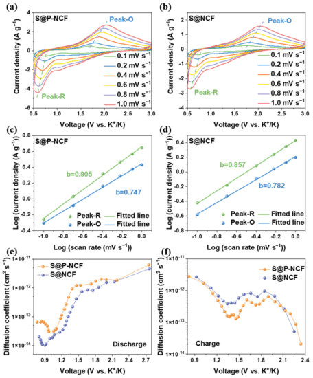 Multi-scan rates CVs and the galvanostatic intermittent titration technique (GITT) were employed to demonstrate the kinetics of the sulfur cathodes. The CVs at different scan rates were further examined for the in-depth kinetic analyses. Figure 4a,b display the CV curves at the scan rates of 0.1, 0.2, 0.4, 0.6, 0.8, and 1.0 mV s−1 of S@P-NCF and S@NCF, respectively. These CV curves exhibit a similar profile, except for a noticeable shift as the scan rate increases. As the scan rate increases, two major peaks (labeled Peak-R and Peak-O, respectively) for both S@P-NCF and S@NCF can be observed. The reaction mechanisms of S@P-NCF and S@NCF can be evaluated based on an established formula of log i = b log v + log a, where i is the peak current, v is the scan rate of the CV and b is a constant ranging from 0.5 to 1. When the b value is approaching 0.5 or 1, the system is under the diffusion dominated or surface capacitive-controlled process, respectively [73]. Figure 4c shows the b values of S@P-NCF for Peak-R and Peak-O, which are fitted to be 0.905 and 0.747, respectively. This indicates that the reduction conversion reaction of S@P-NCF is a rapid dynamic pseudocapacitance behavior. The b values of S@NCF for Peak-R and Peak-O are 0.857 and 0.782, respectively (Figure 4d). Interestingly, for S@P-NCF, the b value of Peak-R is higher than that of S@NCF, while the b value of Peak-O is lower than that of S@NCF. This indicates that S@P-NCF exhibits more facile discharge kinetics, while for the charge process, S@NCF shows better reaction kinetics. The GITT was measured to further reveal the K-ion diffusion kinetics. Figure S10 displays the discharge/charge profiles of GITT. Figure 4e,f show the K-ion diffusion coefficients under different voltages calculated based on Figure S11 during discharge and charge process, respectively. As shown in Figure 4e, in the discharge process, S@P-NCF delivers higher K-ion diffusion coefficients than those of S@NCF. Nonetheless, in the charge process, S@NCF has higher K-ion diffusion coefficients (Figure 4f). This indicates that the reaction kinetics of S@P-NCF is better in the discharge process and inferior during the charge process than that of S@NCF, which is consistent with the results in Figure 4c,d. It is reasonable to believe that more microporous structures and nitrogen heteroatoms in P-NCF can enhance the binding between sulfur and carbon matrix, improve the reaction kinetics during the discharge process, and accelerate the conversion of sulfur species to K2S, thus, achieving an ultrahigh specific capacity and large utilization of sulfur. Nevertheless, during the charge process, the depotassiation of low-order KPSs is more sluggish for S@P-NCF, which makes insoluble and insulating low-order KPSs easy to accumulate to form “dead polysulfide”, and thus lose electroactivity, leading to capacity decay and pessimistic capacity retention [28].