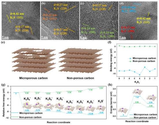 HRTEM images of (a,b) S@P-NCF and (c,d) S@NCF discharged to 0.5 V versus K+/K. (e) Schematic illustration of microporous carbon model and non-porous carbon models. (f) Comparison of the binding energies of various K2Sx molecules bound to microporous and non-porous carbon models, respectively. (g) Energy profiles for the reduction in KPSs on microporous and non-porous carbon models; the insets are the corresponding adsorption configurations of KPSs on microporous carbon model. (h) The decomposition energy profiles of K2S on microporous and non-porous carbon models; the insets are decomposition path of K2S on microporous carbon model.