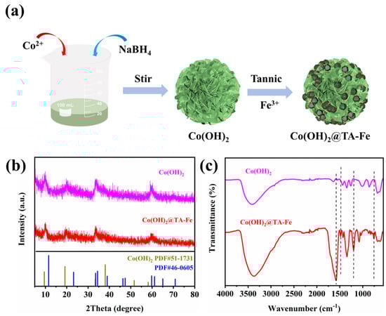(a) Schematic image of the preparation route of Co(OH)2@TA−Fe. (b) XRD patterns and (c) FT−IR spectra of Co(OH)2 and Co(OH)2@TA−Fe.