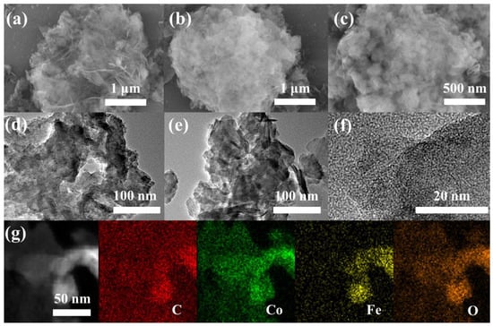 The morphologies were characterized by scanning electron microscopy. As shown in Figure S1, the Co(OH)2 was formed by a large number of cross-linking nanosheets, which could provide sufficient regions to attract exogenous components for assembly to form heterostructures. The co-addition of tannic acid and FeCl3·6H2O led to the formation of a large number of metal-TA particles on the surface (Figure 2a–c). In addition, comparing Co(OH)2@TA with Co(OH)2@Fe together, the combination of individual tannic acid or FeCl3 with Co(OH)2 did not destroy the overall nano-flake morphology of the Co(OH)2 (Figures S2 and S3). If the tannic acid was coordinated with FeCl3·6H2O directly in the absence of a Co(OH)2 substrate, irregular large particles were produced (Figure S4). This striking morphological difference suggested the confined growth of the coordination assembly on Co(OH)2. Further observation of the detailed structure of the Co(OH)2@TA-Fe using transmission electron microscopy (TEM) revealed that the Co(OH)2 nanosheets were wrapped with many TA-Fe nanoparticles (Figure 2d,e), which was consistent with the SEM observations. There were no obvious lattice stripes on the high-resolution TEM images, demonstrating the formation of an amorphous phase of TA-Fe particles (Figure 2f). In the elemental mapping images, a uniform distribution of C, Co, Fe and O elements was observed (Figure 2g). According to the EDS elemental analysis, the weight ratios of Fe and Co were 4.1% and 24.19% (wt%), respectively, which were close to the results obtained from the ICP testing (Figure S5 and Table S2).