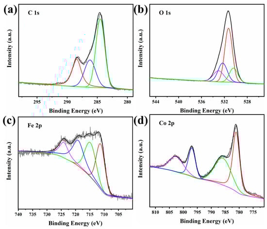The elemental chemical bonding states of the Co(OH)2@TA-Fe were investigated by X-ray photoelectron spectroscopy (Figure S6). Figure 3a shows the XPS spectra of element C. The binding energy peaks at 284.5, 286.2 and 288.4 eV belonged to C-C, C-O and C=O [], respectively, while in the XPS spectrum of O, the binding energy located at 530.4 eV was attributed to metal-O bonding, and 531.3, 532.3 and 533.2 eV were attributed to C=O, O-H and C-O, respectively [,]. The XPS spectra of Fe showed that 711.2, 714.8 and 724.1 eV belonged to Fe3+ and 719.1 eV was the satellite peak of Fe3+ (Figure 3c) [,]. Finally, the XPS of Co was split into 781.1 and 796.9 eV attributed to Co2+ and 785.8 and 802.6 eV attributed to their satellite peaks, which were not quite different from the XPS of the Co(OH)2 (Figure S7) []. The above analyses further proved the formation of the TA-Fe complex and its successful attachment on Co(OH)2. The weight of Fe and Co for the Co(OH)2@TA-Fe obtained by XPS calculations were 13.9% and 26.36% (wt%) (Table S3). The large difference in the contents determined by XPS and other methods may be due to the structure that the TA-Fe loaded on the Co(OH)2 surface. Therefore, the amount of iron determined on the surface was larger than that determined by other methods, since XPS is a surface-sensitive analytical method.