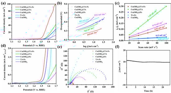 The catalysts were tested for their OER electrocatalytic performance using the assembled three-electrode system in 1 M KOH solution. As shown in Figure 4a, the linear sweep voltammetry curves of all samples were not iR compensated. The overpotential of the Co(OH)2@TA-Fe sample was 297 mV with respect to the reference current density of 10 mA cm−2. This overpotential of 297 mV was much lower than that of the Co(OH)2@TA (361 mV), Co(OH)2@Fe (381 mV), TA-Fe (427 mV) and Co(OH)2 (455 mV). This demonstrated that compounding TA-Fe particles with Co(OH)2 substantially improved the electrocatalytic activity of the catalysts. The overpotential of the Co(OH)2@TA-Fe increased when the amount of feeding tannic acid increased (Figure S8), proving that the formation of more TA-Fe complexes did not lead to further performance enhancement of the samples. Samples with different feeding Fe amounts were also prepared, and it was again proved that Co(OH)2@TA-Fe with a proper amount of source Fe possessed excellent electrocatalytic properties (Figure S9). Moreover, the Tafel slope of the Co(OH)2@TA-Fe (64.8 mV dec−1) was lower than that of the Co(OH)2@TA (75.9 mV dec−1), Co(OH)2@Fe (79.2 mV dec−1), TA-Fe (66.1 mV dec−1) and Co(OH)2 (133.3 mV dec−1), suggesting its faster intrinsic reaction kinetics enabled by the Co(OH)2@TA-Fe heterostructure. Compared with many recently reported catalysts (Table S4), such as Co3−xFexO4 (294 mV, 47.3 mV dec−1) [], MPN@Fe3O4 (260 mV, 33.6 mV dec−1) [], CoFe(OH)x/GO (294 mV, 63.1 mV dec−1) [], TF@Co(OH)2-500 (317 mV, 47 mV dec−1) [] and CeO2@Co(OH)2 (310 mV, 66 mV dec−1) [], the Co(OH)2@TA-Fe had a comparable or even better catalytic performance.