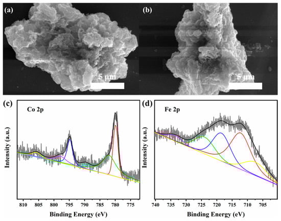 (a,b) SEM images of Co(OH)2@TA-Fe that had undergone stability test and XPS spectra of Co(OH)2@TA-Fe after stability test: (c) Co 2p region, (d) Fe 2p region.