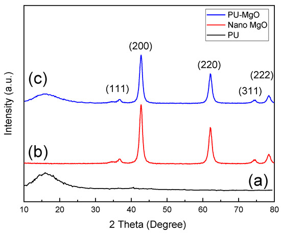 Figure 2a shows the XRD pattern of the PU, where a broad peak at ~20° suggests the amorphous behavior of the polyurethane [46]. Figure 2b presents the XRD pattern of the MgO powder. The results indicate that the whole peaks are linked to the standard cubic MgO reflections (JCPDS 45-0946). The diffraction peaks at 36.65°, 42.53°, 61.85°, 74.0°, and 78.4° correspond to the (111), (200), (220), (311), and (222) MgO crystal planes, respectively [47]. Figure 2c presents the XRD pattern of the synthesized PU-MgO nanohybrids, where every peak associated with the structure of MgO and the peak of ~20° related to the PU structure can be seen. It can be seen that the intensity of the peaks of MgO and PU in the nanohybrids was reduced due to the formation of the hybrid structure and the coverage of the peaks of the two compounds.