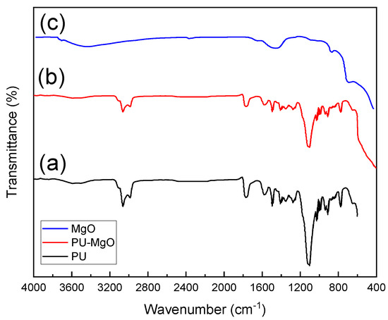 The FTIR spectra of PU, MgO, and PU-MgO nanohybrids are shown in Figure 3. On the PU spectrum, the –CH2– stretching bands were found between 2926 and 2855 cm−1 [48], while the urethane carbonyl band was seen at 1706 cm−1 [1,46,49]. The C–N stretching bands, combined with those of the in-plane bending of N–H, were mostly seen at 1524 cm−1 and 1449 cm−1, showing the reaction between the hydroxyl group and the isocyanate [46]. The characteristic C–O–C band was seen at 1074 cm−1 [46,50]. In the MgO FTIR spectrum, O–H bond vibrations of the hydroxy group were observed in the broadband near 3696 cm−1. MgO nanoparticles were indicated by the peak at 421 cm−1 [51,52]. At 1386 cm−1, vibrations associated with C–H bending were detected [52]. The peaks seen at 1741 cm−1 and 1644 cm−1 indicated the presence of strong C=O and C=C stretching, while the peak at 3261 cm−1 showed the existence of weak, broad O-H bond stretching [46]. In the spectrum of the PU-MgO nanohybrids, peaks related to PU and MgO were observed.