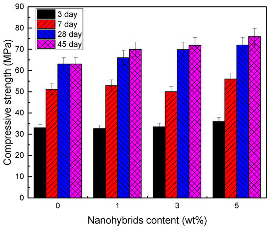 Compressive strength of cement pastes with different nanohybrid contents at 3, 7, 28, and 45 days.