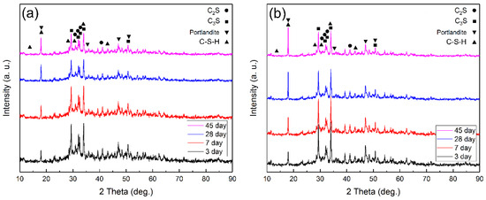XRD patterns of cement pastes at 3, 7, 28, and 45 days with different nanohybrids: (a) 0 wt% and (b) 3 wt%.