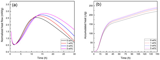 Hydration heat of cement paste with different nanohybrids vs. time: (a) instantaneous heat flow and (b) cumulative heat flow.