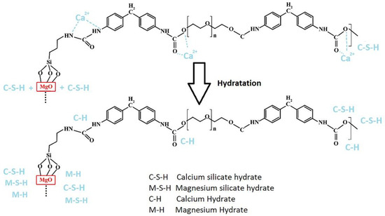 Figure 11 shows the mechanism of the effect of the nanohybrids on cement hydration products. Moreover, Mg(OH)2 and magnesium silicate hydrate (M-S-H) are formed. The results confirmed that the crystallinity of C-S-H was enhanced in the specimen that contained nano-MgO compared to the plain sample. Furthermore, by altering the degree of crystallinity, the length of the silicate chain and the silicate density through the layer (crosslinking) for C-S-H in MgO-containing samples compared to those in the plain samples were increased more steeply. Therefore, adding a moderate amount of MgO to the cement-based composites led to improvement in mechanical properties because of the incorporation of moderate amounts of Mg2+ ions in the C-S-H nanostructure and the modification of the latter [62,67,68,69]. The results obtained for the PU-MgO nanohybrids showed a similar mechanism. Many polymers, including polyurethane, can absorb dissolved metal ions due to the presence of carboxyl and amino groups in their structure. In the synthesized nanohybrids, dissolved calcium ions can be absorbed by oxygen or nitrogen atoms of the polyurethane chain and then turned into calcium hydrate and participate in pozzolanic reactions. Various studies have reported the interaction between nitrogen and oxygen in the polymer chain as a factor in the absorption of soluble metal ions [70,71,72].