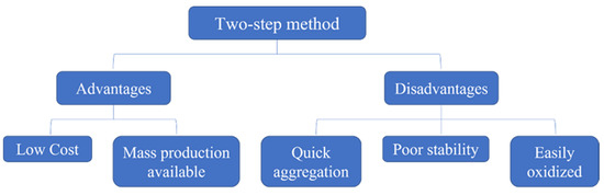 The performance of nanofluids is closely related to the preparation method. Common preparation methods are one-step and two-step methods [16,17,18]. The one-step and two-step methods each have advantages and disadvantages, as shown in Figure 1 and Figure 2. The appropriate method should be chosen for the preparation of nanofluids [19].