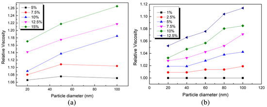 Effect of nanoparticle size on viscosity [56]: (a) Al2O3; (b) ZnO.