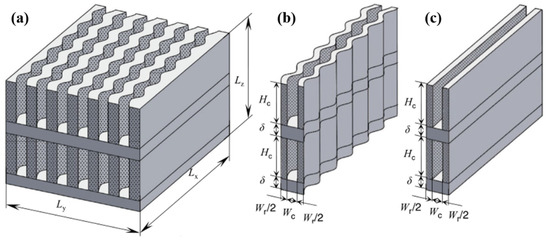 DL-MCHS structural model [128]: (a) upper layer wavy and lower layer straight; (b) double layer wavy; (c) double layer straight.