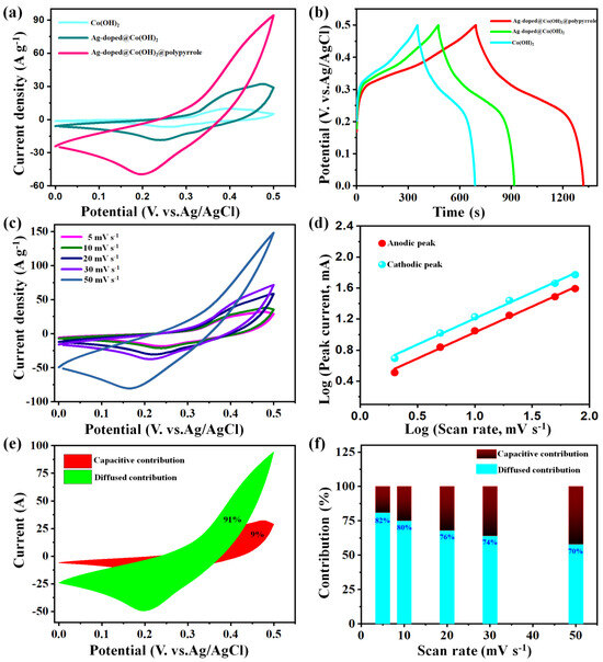 CV data at 5 mV s−1 (a) and GCD data at 2 A g−1 (b) of Co(OH)2 nanoparticles, Ag-doped@Co(OH)2 NPs, and Ag-doped@Co(OH)2@polypyrrole NS electrodes; CV curves (c) and log(i) vs. log(v) plots (d) of the Ag-doped@Co(OH)2@polypyrrole NS electrode; diffusion and capacitive contributions of the Ag-doped@Co(OH)2@polypyrrole NS electrode at 5 mVs−1 (e); charge storage contributions of the Ag-doped@Co(OH)2@polypyrrole NS electrode at various scan rates (f).