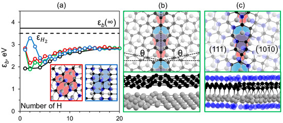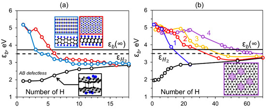 The presence of several nearby vacancies can facilitate diamond formation. In contrast to the vacancy located only in one layer, we considered the agglomeration of cross layer vacancies in bilayer AB stacked graphene which can be obtained by its irradiation with low-energy ion beams of high density. In this structure, the defects affect each other. It leads to the formation of a reactive area between them which easily binds hydrogen atoms and forms interlayer bonds. We considered an agglomerate of vacancies separated from each other by about 5 Å, as seen in Figure 1b. After full passivation of the atoms in the first coordination sphere of the vacancy (binding energy 4.6–4.9 eV), passivation occurs in the region between the vacancies producing a fully hydrogenated area (Figure S4). After this step, hydrogen adsorbs on the outer perimeter of the agglomerate forming a hydrogenation front that spreads uniformly in all directions. As can be seen from Figure 1b, already after the hydrogenation of the second coordination sphere, the C-H bond energy is equivalent to the corresponding value obtained for perfect graphene. This also confirms the local influence of the defects on the phase transition processes in the bilayer graphene. As the number of nearby vacancies increases, the reactive region enlarges. It results in the shift of εb (n) intersection with from 15 atoms for 1 vacancy (blue line in Figure 1b) to 65 hydrogen atoms for the agglomerate of 4 vacancies (purple line in Figure 1b), respectively. For the latter case, the average C-H binding energy differs only slightly from .