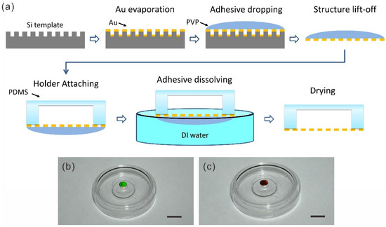 24]. In the previous method, once the metal structures have been transferred to the target substrate, they would permanently stay on the cured adhesive layer of insoluble epoxy. Along this technique route, a soluble adhesive is often used to release the as-patterned metal nanostructures from the templates without permanent attachment. Accordingly, we choose a water-soluble polymer, polyvinylpyrrolidone (PVP, CAS number: 9003-39-8) instead of an epoxy to temporarily hold the structures before releasing. In addition, the PVP adhesive has to be thick enough to avoid it flowing into the gaps between the nanostructures and touching the template. We note that some of the physical and chemical properties of the PVP have to be considered in the process design. For example, the melting point of the PVP is usually between 150 and 180 °C, so it is necessary to limit the ambient temperature to a proper range when it is combined with other applications. Since the PVP is incompatible with strong oxidizing agents, the following process may not fit into the fabrication procedures in the silicon industry and thus, specific measures should be taken during particular applications.
