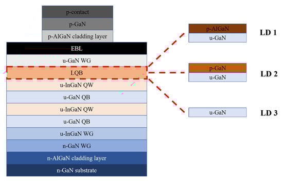 - Wang, W.J.; Liao, M.L.; Yuan, J.; Luo, S.Y.; Huang, F. Enhancing performance of GaN-based LDs by using GaN/InGaN asymmetric lower waveguide layers. Chin. Phys. B 2022, 31, 074206. [Google Scholar] [CrossRef]