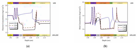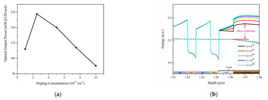 - Yang, J.; Zhao, D.G.; Zhu, J.J.; Liu, Z.S.; Jiang, D.S.; Chen, P.; Liang, F.; Liu, S.T.; Xing, Y. Effect of Mg doping concentration of electron blocking layer on the performance of GaN-based laser diodes. Appl. Phys. B Lasers Opt. 2019, 125, 235. [Google Scholar] [CrossRef]