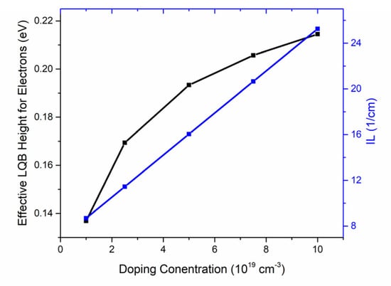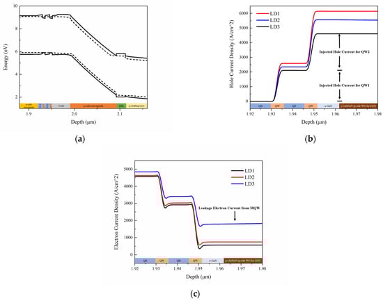 - Chen, P.; Zhao, D.G.; Jiang, D.S.; Zhu, J.J.; Liu, Z.S.; Le, L.C.; Yang, J.; Li, X.; Zhang, L.Q.; Liu, J.P.; et al. The effect of composite GaN/InGaN last barrier layer on electron leakage current and modal gain of InGaN-based multiple quantum well laser diodes. Phys. Status Solidi. A 2015, 212, 2936–2943. [Google Scholar] [CrossRef]