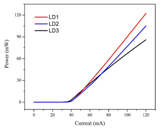 - Asano, T.; Takeya, M.; Tojyo, T.; Mizuno, T.; Ikeda, S.; Shibuya, K.; Hino, T.; Uchida, S.; Ikeda, M. High-power 400-nm-band AlGaInN-based laser diodes with low aspect ratio. Appl. Phys. Lett. 2002, 80, 3497–3499. [Google Scholar]