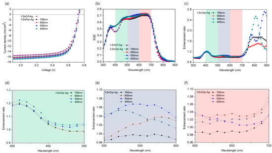 Characteristics of unpatterned ultrathin organic photovoltaic (OPV) and OPVs with various pattern periods. (a) J-V curves under AM 1.5 G illumination at 100 mW/cm2, (b) external quantum efficiency (EQE) spectra, (c) enhancement ratio of EQE, and (d–f) enlarged graph of the colored part of the enhancement ratio of EQE data in (c).
