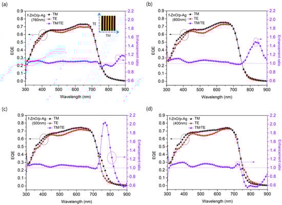 EQE spectra and EQE enhancement ratio of ultrathin OPVs measured in transvers magnetic (TM) and transvers electric (TE) modes for pattern period of (a) 760 nm, (b) 600 nm, (c) 500 nm, and (d) 400 nm. Enhancement ratio was calculated by dividing the TM value by the TE value. The inset in (a) illustrates the TM and TE modes.