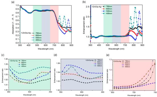 (a) Absorption spectra and (b) absorption enhancement ratio of ultrathin OPVs with pattern periods of 760, 600, 500, and 400 nm. Enhancement ratio was calculated by dividing the values of each patterned OPV by the value of the reference device. (c–e) Enlarged view of the colored part of enhancement ratio in (b).