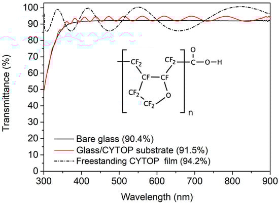 Transmittance spectra of bare glass, a glass/amorphous fluoropolymer (CYTOP) substrate, and a freestanding CYTOP film. Inset shows the chemical structure of CYTOP.