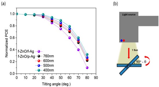 (a) Incident angle dependence of reference device and OPVs with various pattern periods. Data show normalized PCEs. (b) Setup for incident angle dependence measurement. A tilt angle of 0° means that the light is incident vertically.