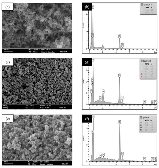 As shown in Figure 5, the FE-SEM with EDX analysis was performed to observe the morphological structure and verify the elemental compositions such as Ti, O, N, and Pt. In Figure 5a, the agglomeration of spherical particle size was observed for unmodified TiO2, while the morphology of the NPseq-TiO2 photocatalyst formed an irregular shape of particles and no clump particles as compared to the morphology in the PNrev-TiO2 photocatalyst where it contributed a larger cluster of particles, as seen in Figure 5c,e. Meanwhile, the EDX analysis found that the composition of the elements in the TiO2 photocatalyst did not change significantly, because the commercially available TiO2 was used as the starting material. As a result, the percentage of Ti and O was found to be approximately 46.8 wt.% and 53.2 wt.%, respectively (see Figure 5b), where the weight percent is comparable with a previous study [42]. Furthermore, the main concern for this research was the presence of N in the NPseq-TiO2 and PNrev-TiO2 photocatalysts. Based on the EDX analysis, the N content was successfully detected in the NPseq-TiO2 photocatalyst, ca., 0.6 wt.%, while no presence of N elements was detected for the PNrev-TiO2 photocatalyst, as shown in Figure 5d,f, respectively. This might be due to the low interaction bonding between the N and Pt-TiO2 photocatalyst prepared via calcination treatment. The weak bonding caused the N to be eliminated more easily during the photodegradation process, which affected the photocatalytic performance of the PNrev-TiO2 photocatalyst. However, there was no significant change in the availability of Pt in NPseq-TiO2 and PNrev-TiO2 photocatalysts.