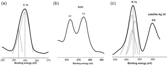Typical XPS spectra for the Ag/PHMB sample (a) C 1s, (b) Ag 3d, and (c) N 1s photoelectron spectra (counts per second, cps vs. binding energy, B.E.).