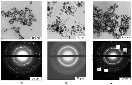 Typical electron microphotographs and X-ray diffraction patterns of (a) Ag/PHMB; (b) Ag/STAPCG; (c) Ag/SLES nanoparticles. Microphotographs and diffractograms of other nanoparticles were similar.
