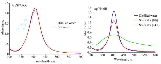 Examples of UV-vis spectra for stable (Ag/STAPCG) and unstable (Ag/PHMB) AgNPs diluted in distilled water and seawater (10–15 mg/L).