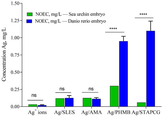 Effects of AgNPs on sea urchin P. lividus and zebrafish Danio rerio embryos. Sea urchin embryos were exposed to AgNPs at the fertilized egg (FE) stage. NOEC: maximal no observed effect concentration (****—statistically significant; ns—statistically not significant).