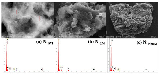 SEM images and EDX spectra of Ni-loaded ex-g-CN synthesized using the (a) incipient wet impregnation (IWI) method, (b) colloidal method (CM), and (c) precipitation deposition method (PRDM).