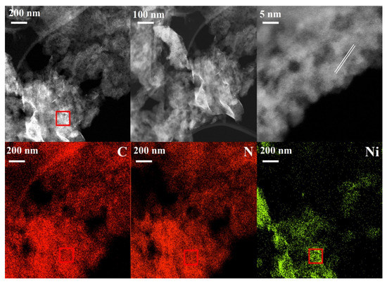 The Brunauer–Emmett–Teller (BET) surface area was determined from a nitrogen adsorption–desorption experiment at 77 K (quadrasorp, Quantachrome, Boynton Beach, FL, USA). The crystalline phases were examined using X-ray diffraction (XRD, Mini Flex 600C, Rigaku, Tokyo, Japan) was conducted using CuKα radiation at a voltage, current, and spin speed of 40 kV, 15 mA, and 80 rpm, respectively, in the range between 3° and 60° 2θ with a step size of 0.0075°. Transmission electron microscopy (TEM, JEM-ARM300F2) images were obtained using a probe corrected with a cold FEG emitter (JEOL Ltd., Tokyo, Japan) operated at 300 kV with a camera length of 10 cm. The acquired and evaluated high-angle annular dark-field images represent a detection angle of 54–220 mrad. The image contrasts were formed mainly by Rutherford scattering and were correlated to the atomic number. X-ray photoelectron spectroscopy (XPS, Phoibos 150 analyzer, SPECS GmbH, Berlin, Germany) was conducted under ultra-high vacuum conditions (base pressure 5 × 10−10 mbar) using a monochromatic Al Kα X-ray source (1486.74 eV). The energy resolution measured from the FWHM of the Ag 3d5/2 peak for a sputtered silver foil was 0.62 eV at the Catalan Institute of Nanoscience and Nanotechnology in Barcelona. Ni loading in Ni-loaded ex-g-CN samples was determined using inductively coupled plasma optical emission spectrometry (Perkin-Elmer Optima 4300DV model system) in the Chemical Analyses Service of the Universitat Autònoma de Barcelona.