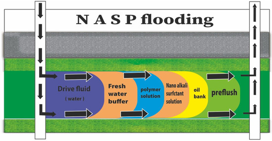 To increase the potential of EOR, the optimum chemical solution is achieved at large injection volumes through injecting alkaline, polymer and surfactant (Figure 3). Oil improvement through ASP flooding has been reported previously. The principle of this method is the reaction between alkali and organic to create petroleum soaps. These petroleum soaps will interact with surfactants to reduce the IFT to minimum value (10−4 mN/m). In addition, the polymer is used to reduce the viscosity ratio of oil/water interface. Reduction of IFT and oil viscosity significantly improve vertical and displacement efficiency. ASP flooding is used for heavy oil reservoirs [25]. Recently, nanoparticle is mixed with the chemicals above to reduce the cost of these chemicals, modify the wettability, minimize oil-water IFT and boost oil recovery efficiency. Table 3 examines the types of process efficiencies for each of the methods used in the article, and predicts the amount of efficiency by NASP: