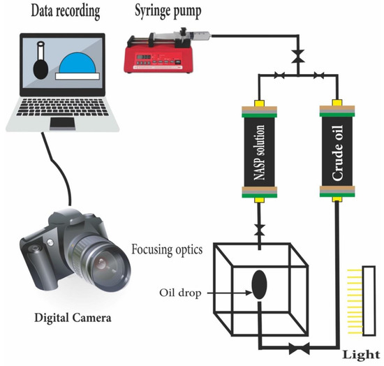 Table 1 depicts a summary of previous ASP works while highlighting the role and mechanisms of each chemical alone and in hybrid for enhancing oil mobilization. To enhance the mobility and investigate the role of the injected NASP, the volumetric sweeping efficiency micromodel as a future new insight in EOR would have been a new recommendation for oil companies. A micromodel experiment (Figure 1) is a future planned model to investigate the mechanism of the fluid flow on porous media via flow visualization, fluid interactions, pore space geometry and heterogeneity effects. To carry out the test, the oil–wet glass micromodel would be saturated with oil, followed by the injection of the prepared hybrid nano-ASP solution. The micromodel is placed horizontally to avoid the gravity effect. During the tests, high resolution pictures will reveal the fluid distribution in the micromodel taken at various time intervals.