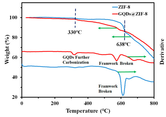 3.5. Thermal Stability Analysis of GQDs@ZIF-8 Composites