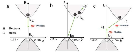Photogenerated carrier recombination mechanism. (a) Radiative recombination, (b) Auger recombination and (c) SRH recombination using energy (E) momentum (K) diagram.