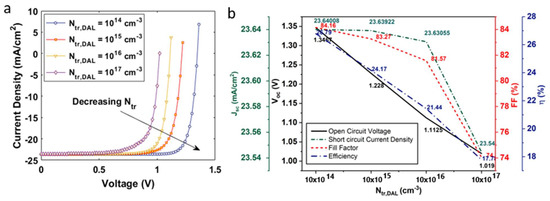 (a) Current density–voltage characteristics of a solar cell under auger recombination; (b) influence of defect density-assisted SRH recombination on the open circuit voltage, short circuit current density, fill factor, and efficiency of the solar cell.